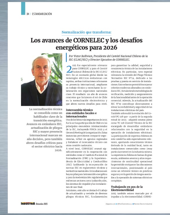 Cerramos el 2025 destacando la publicación de la columna: “Normalización que transforma: los avances de CORNELEC y los desafíos energéticos para 2026”, escrita por Víctor Ballivian , Presidente del Comité Nacional Chileno de la IEC (IEC/CLNC) y Director Ejecutivo de CORNELEC, en la edición de diciembre de Revista ElectroIndustria – EMB – Nextwork360 Latam.